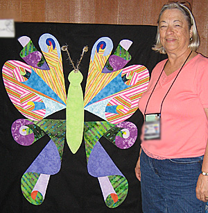 Madam Butterfly by Carol H. Carol attended a 3-D Explosion workshop in Texas. Her butterfly is quilted with double needle, with a shimmery thread in one side. Hubba hubba! |
