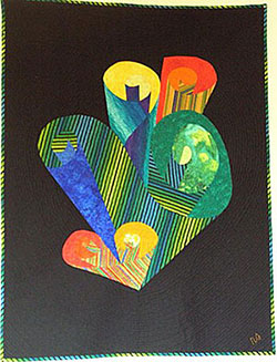 3-D Explosion by Nancy E. Nancy wrote to me, "I had the opportunity to sing (with a large group) at Carnegie Hall last November. When I got home I knew I had to represent the experience with a quilt. Your technique came to mind." What a great idea to have the scrolls coming out of an instrument! |